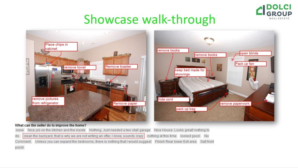 - Before scheduling photos, I will go through EACH room in the house to give you recommendations on how you can set the room up so we have the best possible photos. I will not tell you to do anything extensive, most of the work will be just simple packing up of loose items. Completing my showcase walkthrough will be a key factor in helping your home get TOP dollar.